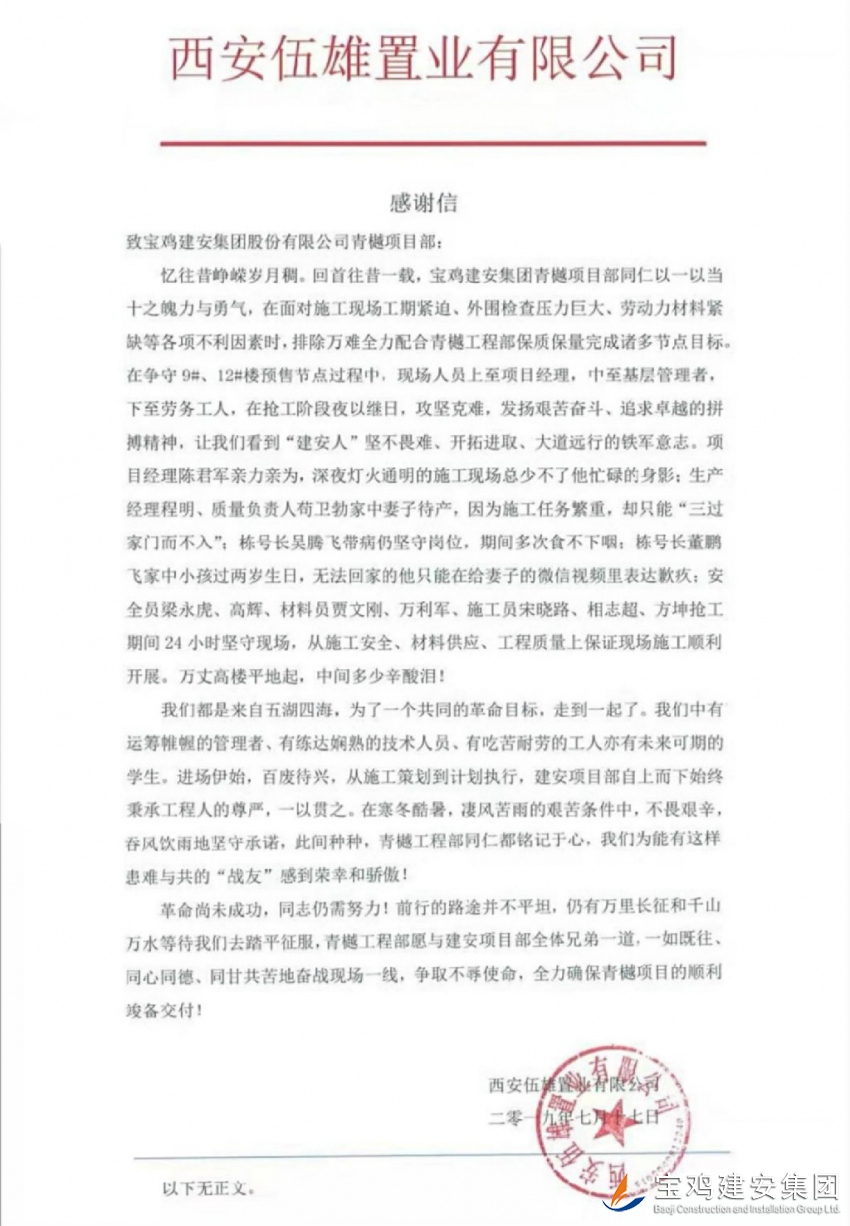 2019年7月17日,我公司路橋項目部承建的中南青樾項目收到由建設(shè)單位西安伍雄置業(yè)有限公司發(fā)出的一封感謝信,信中言辭懇切,對路橋公司青樾項目管理人員給出了極高的評價。在面對施工現(xiàn)場工期緊迫、資金短缺、外圍檢查壓力巨大、勞動力材料緊缺等各項不利因素時,寶雞建安集團青樾項目部各位同仁克服自身困難、艱苦奮斗、不畏艱難以一當(dāng)十之魄力與勇氣保質(zhì)保量并按工期節(jié)點完成了施工任務(wù)。